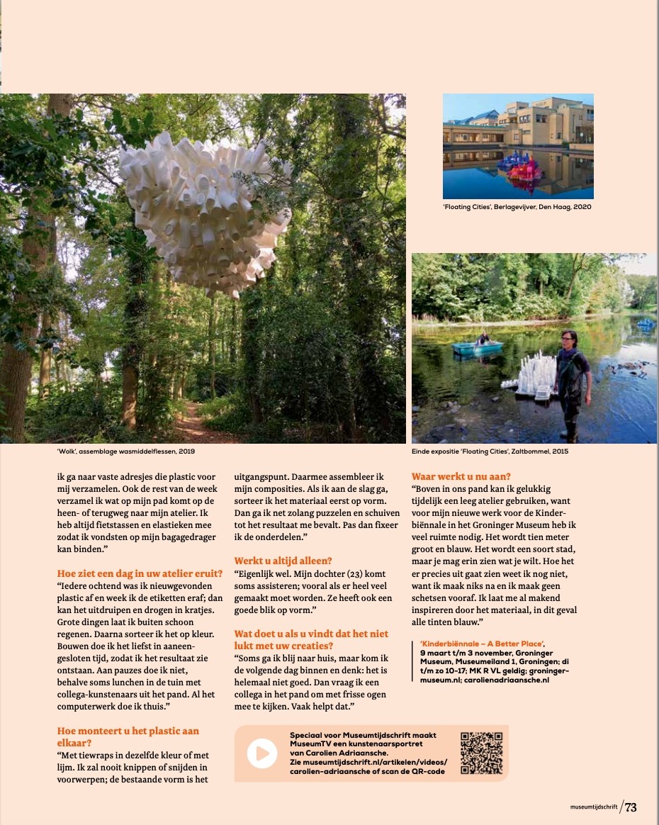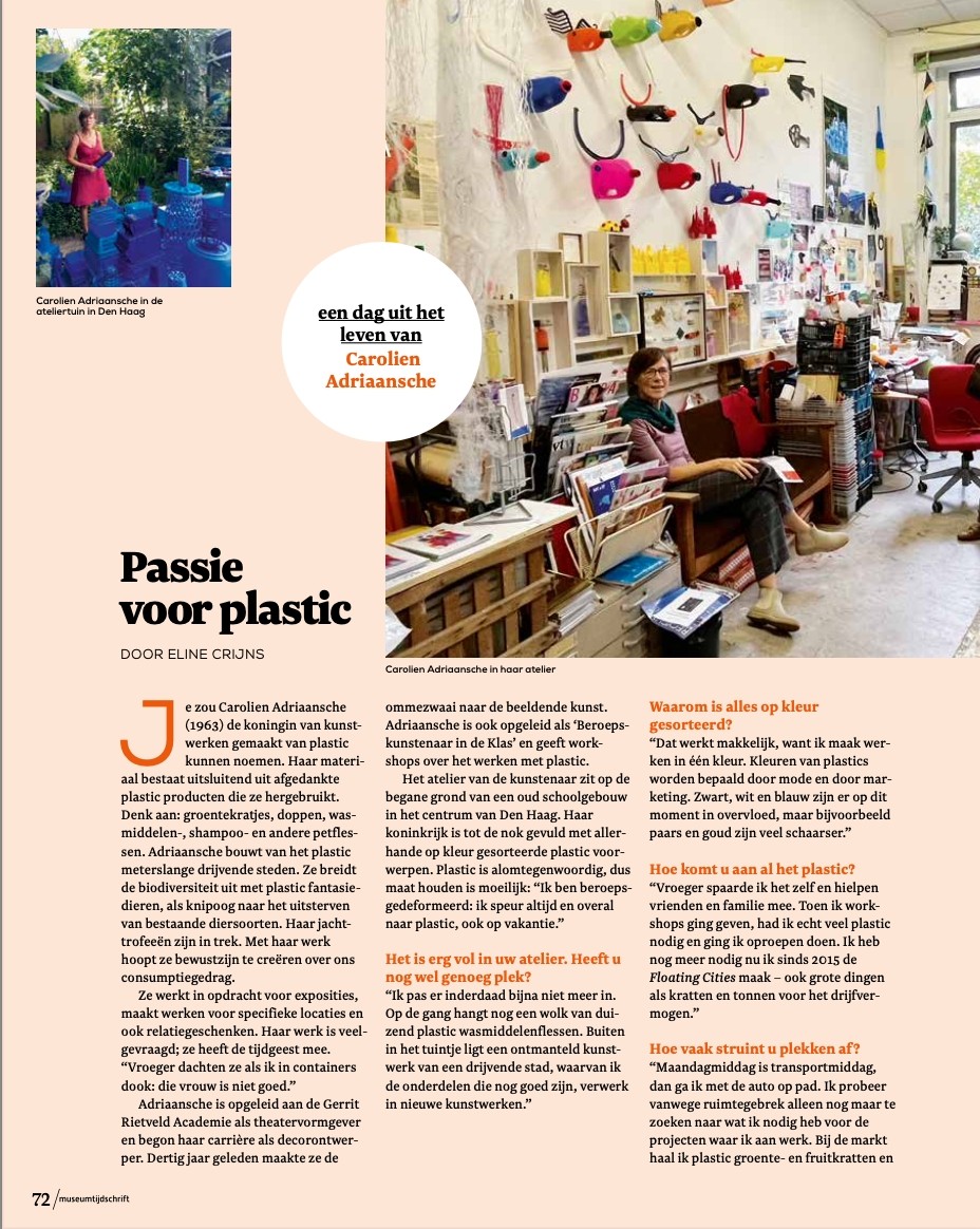 Beeldend kunstenaar Carolien Adriaansche (1963) is de koningin van kunstwerken gemaakt van plastic. Haar materiaal bestaat uitsluitend uit afgedankte plastic producten die ze hergebruikt. Denk aan groente kratjes, doppen, wasmiddelen- shampoo- en petflessen. Adriaansche bouwt van het plastic meterslange drijvende steden en breidt de biodiversiteit uit met plastic fantasie dieren - haar jachttrofeeën zijn befaamd. Met haar werk hoopt ze bewustzijn te creëren over ons consumptiegedrag. Ze werkt in opdracht voor exposities, maakt werken voor specifieke locaties en ook relatiegeschenken. Haar werk is veelgevraagd; ze heeft de tijdgeest mee. “Vroeger dachten ze als ik in containers dook: die vrouw is niet goed.”