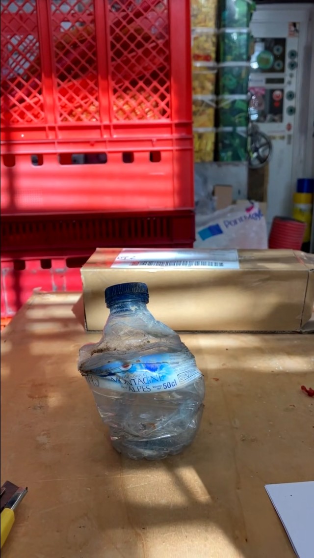 Het zakje met Frans plastic belandde in het atelier bij de andere zakken met ongesorteerd materiaal. Later wordt het verdeeld op kleur of ‘oninteressant’ = workshopmateriaal. Achteraf jammer, want ik had dit goed bij het flesje kunnen gebruiken.
