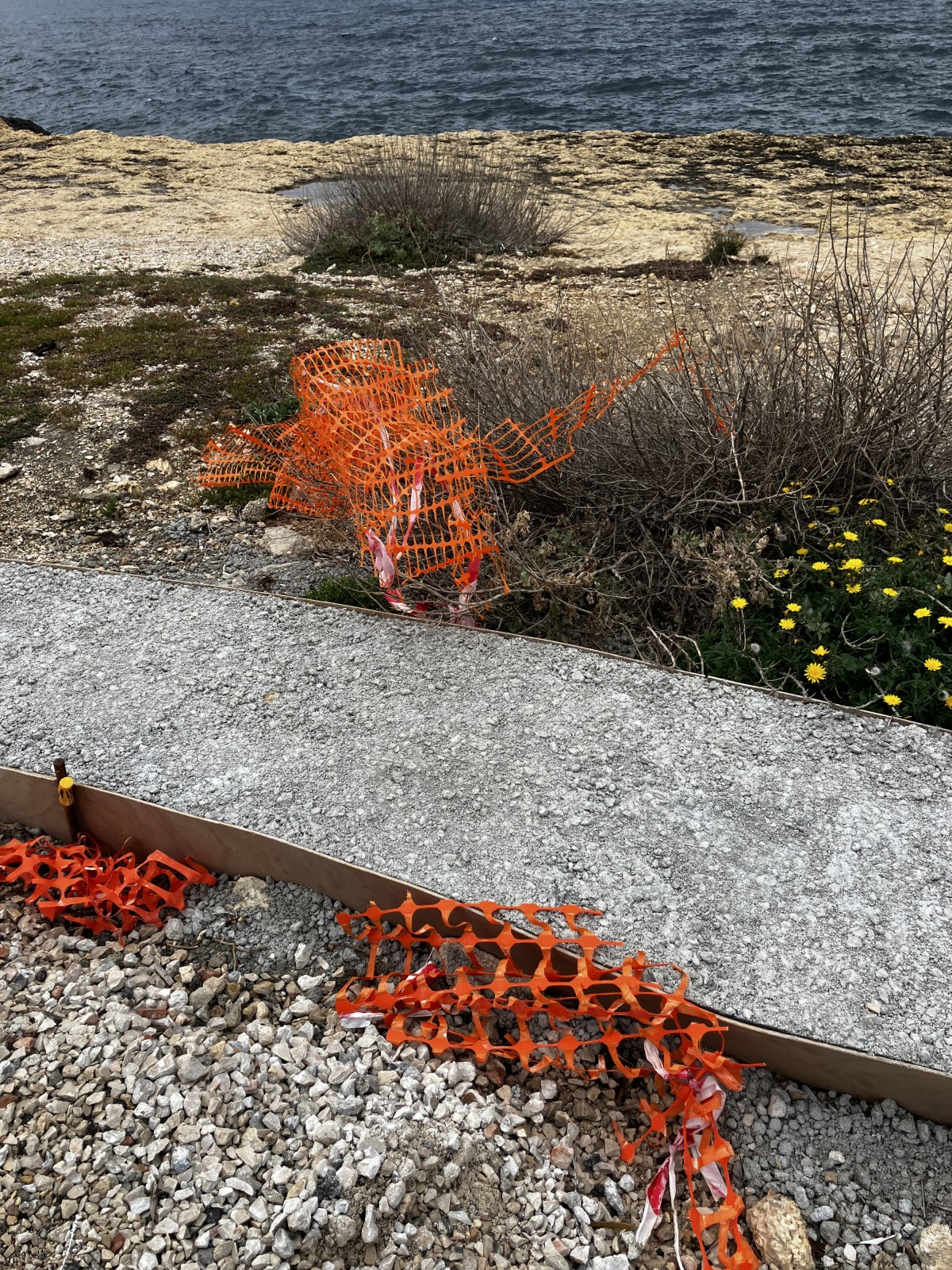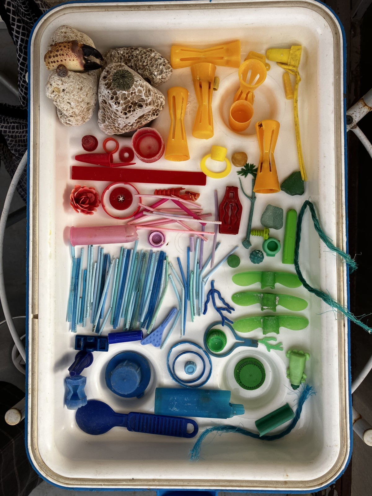In de regen banjerde ik over het strand, op zoek naar plastic afval. Al het verzamelde plastic van de vakantie gaat in een zak mee naar huis om later in het atelier uitgezocht te worden.