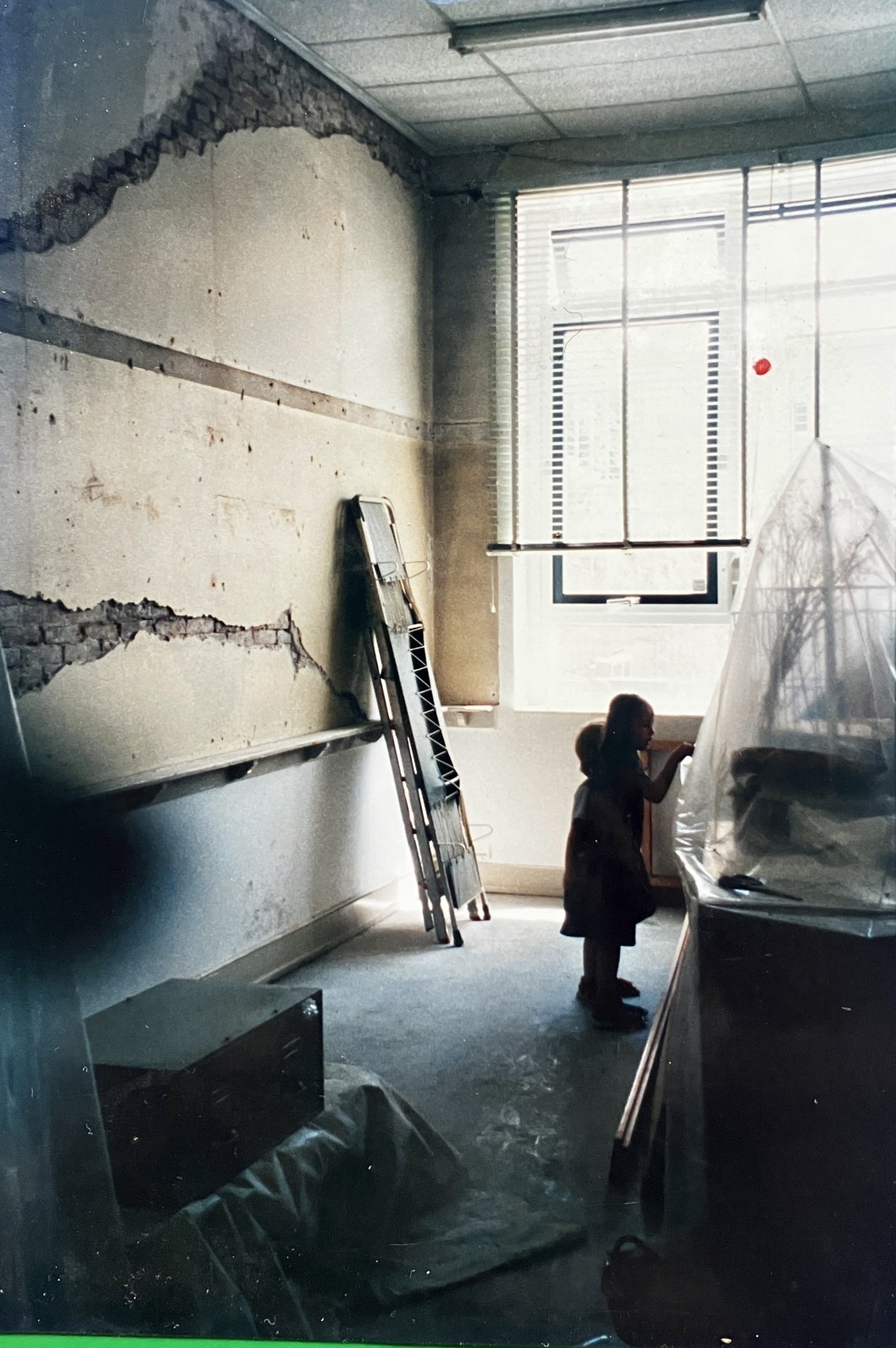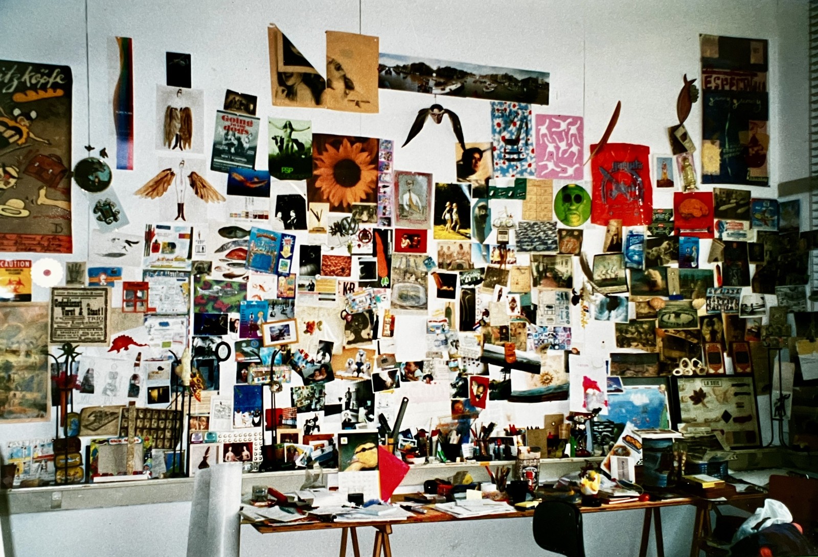 Sinds de oprichting verhuisde ik samen met de andere kunstenaars van Stichting Kunstgreep’95 van de Kennedylaan via de Gedempte Burgwal naar de Prinsegracht 64 in Den Haag. In de 25 jaar die wij nu op de Prinsegracht zitten moest in 2003 het atelier ook leeg ivm een aantal werkzaamheden waaronder het verwijderen van de zachtbordplaten (brandgevaarlijk) die op de wanden waren aangebracht om de scheuren in de muren te camoufleren. Ik vond het toen erg spijtig dat ik afscheid moest nemen van mijn enorme prikbord met inspirerende plaatjes. Maar zoals je kan zien op de foto van de open atelier dag 20 jaar later is dat gewoon weer helemaal goed gekomen.