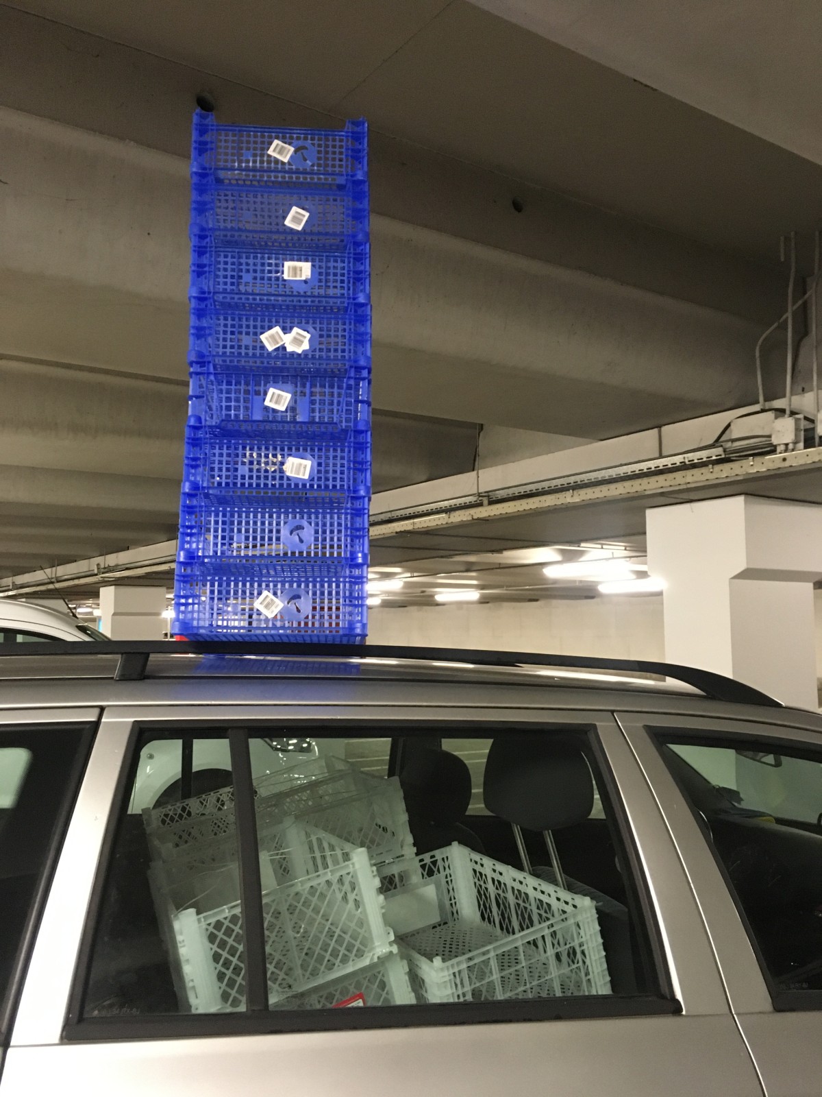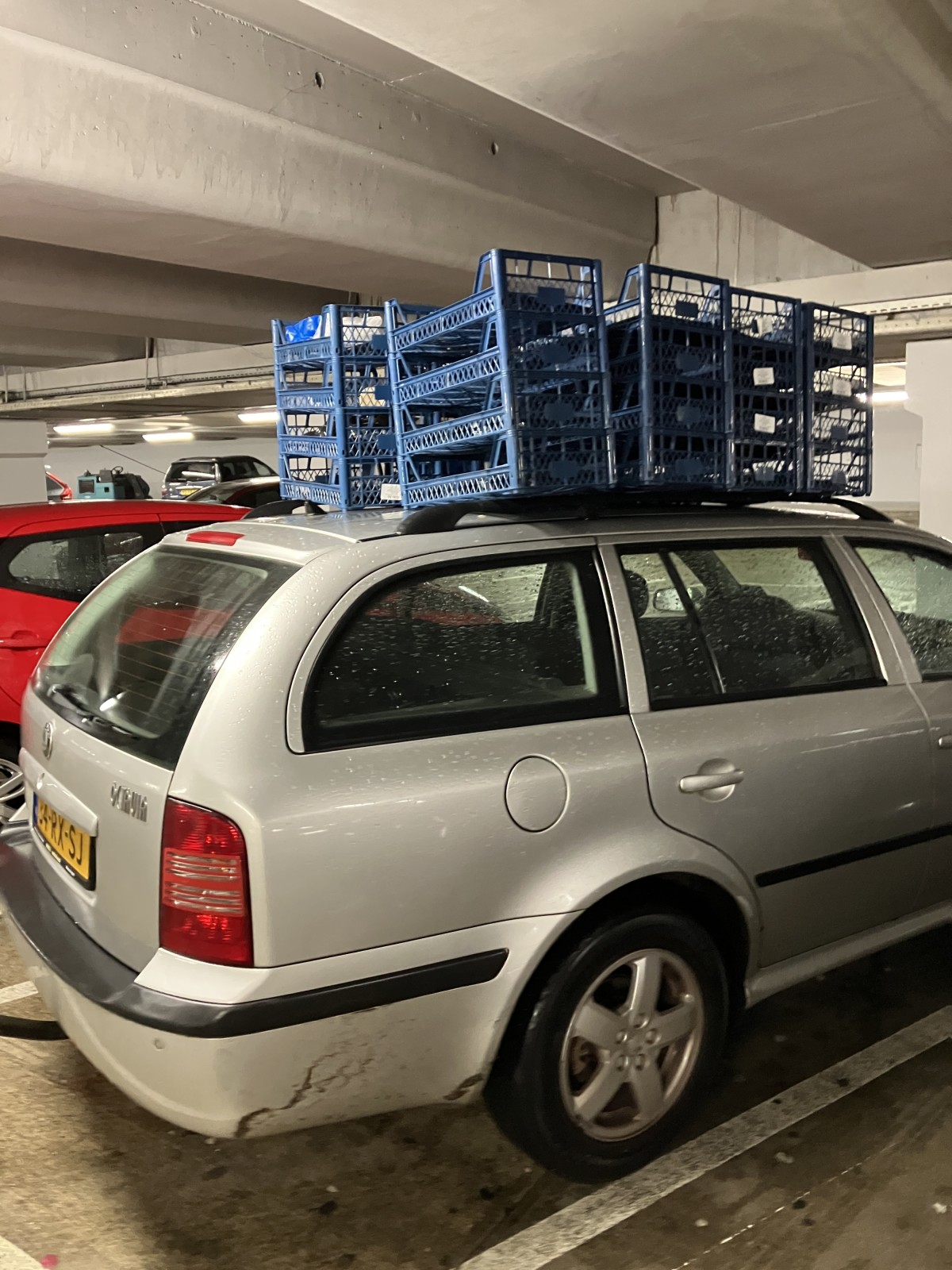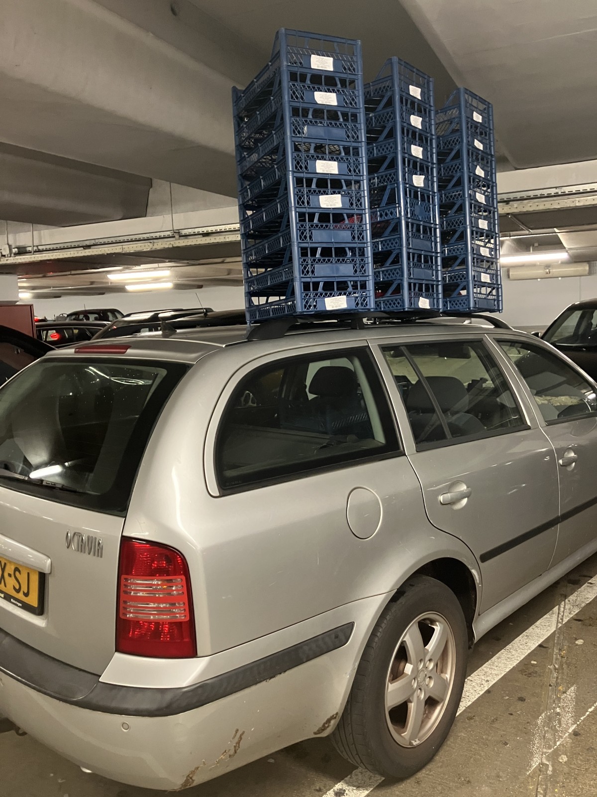 With the upcoming Kinderbiennale at the Groninger Museum and the accompanying children's activities, I need a lot of crates. I have built a network with regular stalls that alert me as soon as white or blue ones are available. These days, my Monday afternoons are dedicated to transport, where I can take around 40 to 50 crates at a time. Sometimes I even make three trips from the market to my studio. Often, I also manage to pass other collection points that afternoon. There are private individuals who have a large stock of plastic but also companies like WEPcircular.