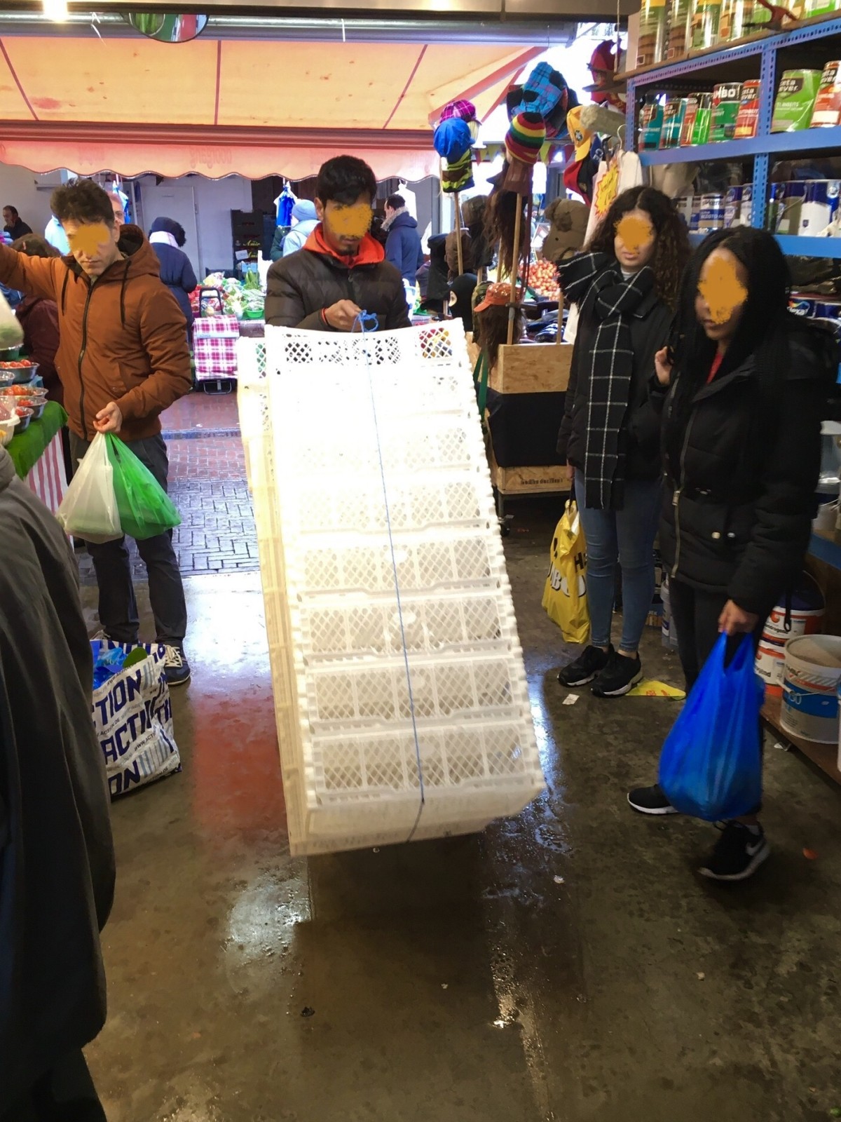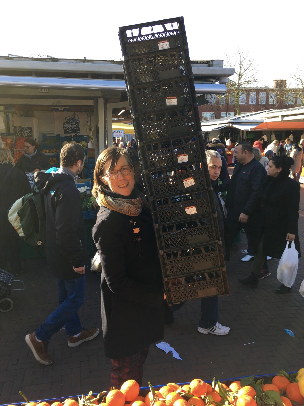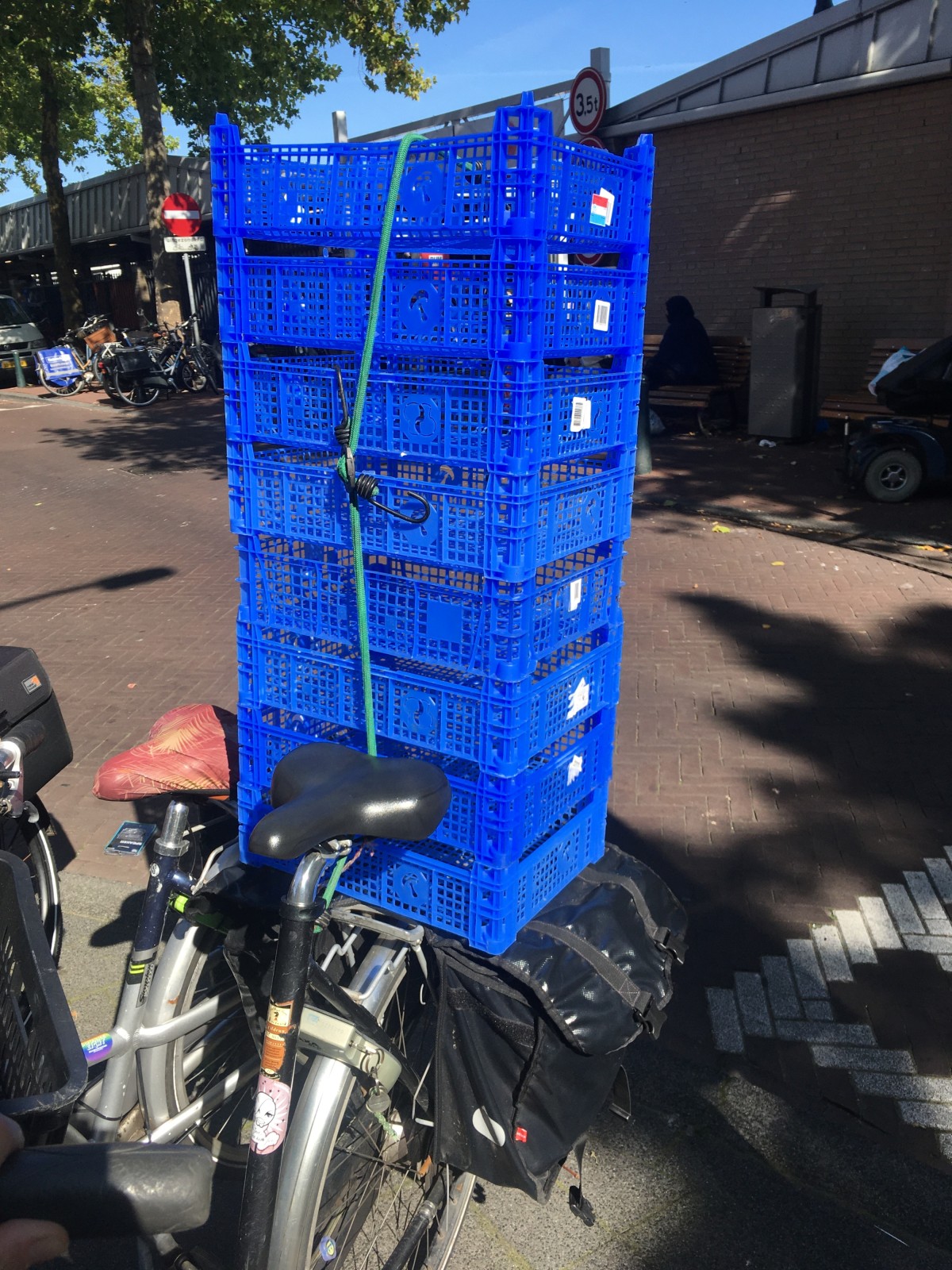 For years, crates have been an indispensable resource for me for my artworks and, of course, for storing my plastic supplies. My search for the crates occurs on an irregular basis, mainly when my artworks or workshops call for it. Of course, I occasionally come across them during my bike ride from home to studio but The Hague Market is my favourite hunting ground.