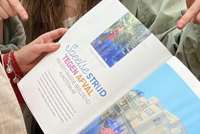 When theatre work could no longer be combined with her young children, she found herself in the classroom as a professional artist. Her name was the Waste Teacher. In the beginning, Carolien scoured the junkyard hoping to find brightly coloured crates or a laundry basket. "I also snooped in construction containers to find waste materials. It's always a surprise what you come across. Acquaintances I asked to keep plastic waste for me. As a souvenir from foreign holidays, I always took detergent bottles with me. At one point, I had so much of it that when I visited somewhere, I brought a milk carton of detergent instead of a bottle of wine. For the workshops at schools, I soon needed more material. At the Haagse Markt, I made arrangements with merchants to keep plastic packaging material for me. I also made contact with companies. At white goods retailer Zwennes, she collects, among other things, cutlery trays from dishwashers. After long insistence, she can pick out special plastic pieces at the Haagse Milieu Service."