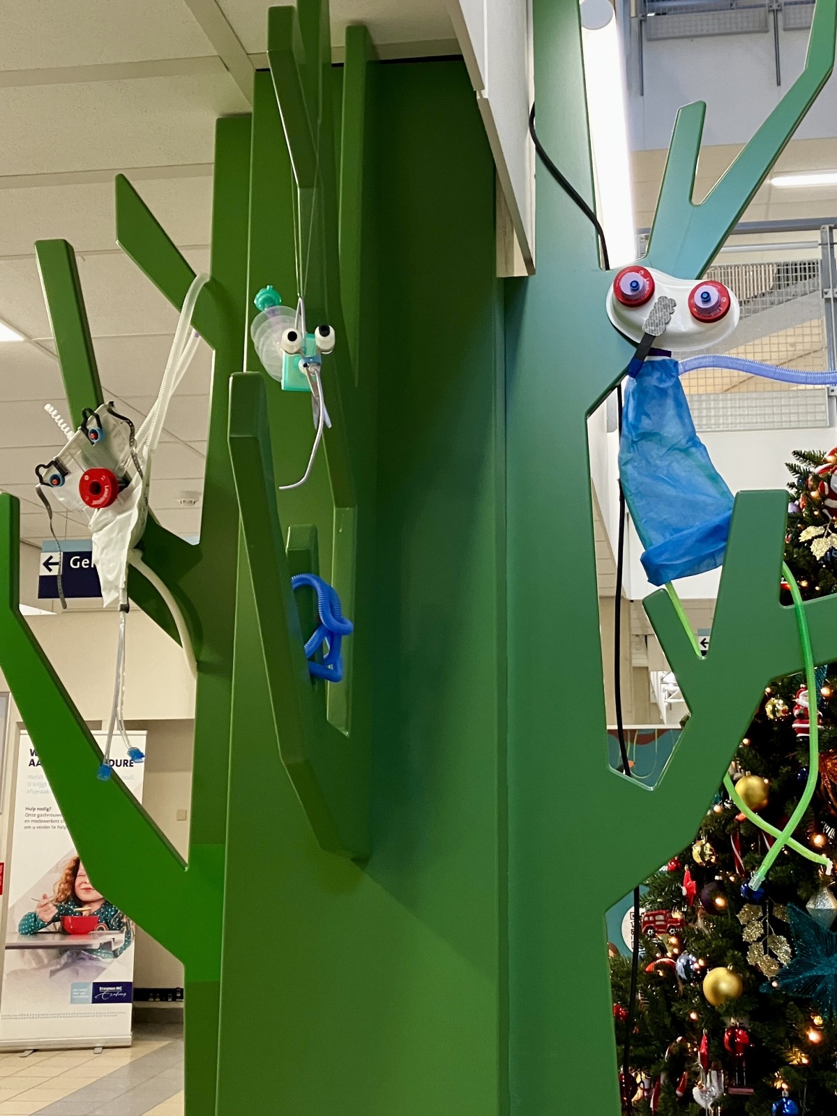 Commissioned by the Greenteam of the Sophia Children's Hospital in Rotterdam, I made a series of small objects/animals from plastic waste from the hospital, which will hang in the trees in the entrance hall throughout January.