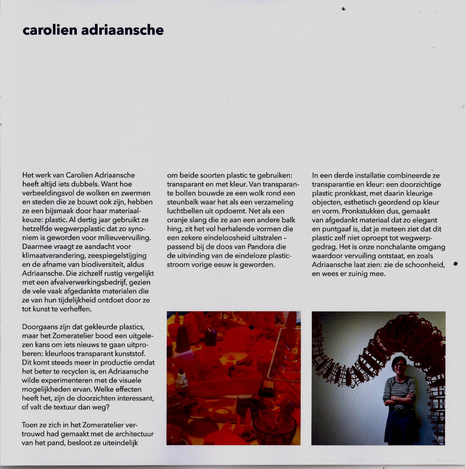 In a third installation, she combined transparency and colour: a translucent plastic showcase, containing colourful objects, aesthetically arranged by colour and shape. Showpieces, in other words, made from discarded material that is so elegant and spot-on that you immediately see that this plastic itself does not incite disposability. It is our nonchalant handling that creates pollution, and as Adriaansche shows: see the beauty, and be sparing with it.