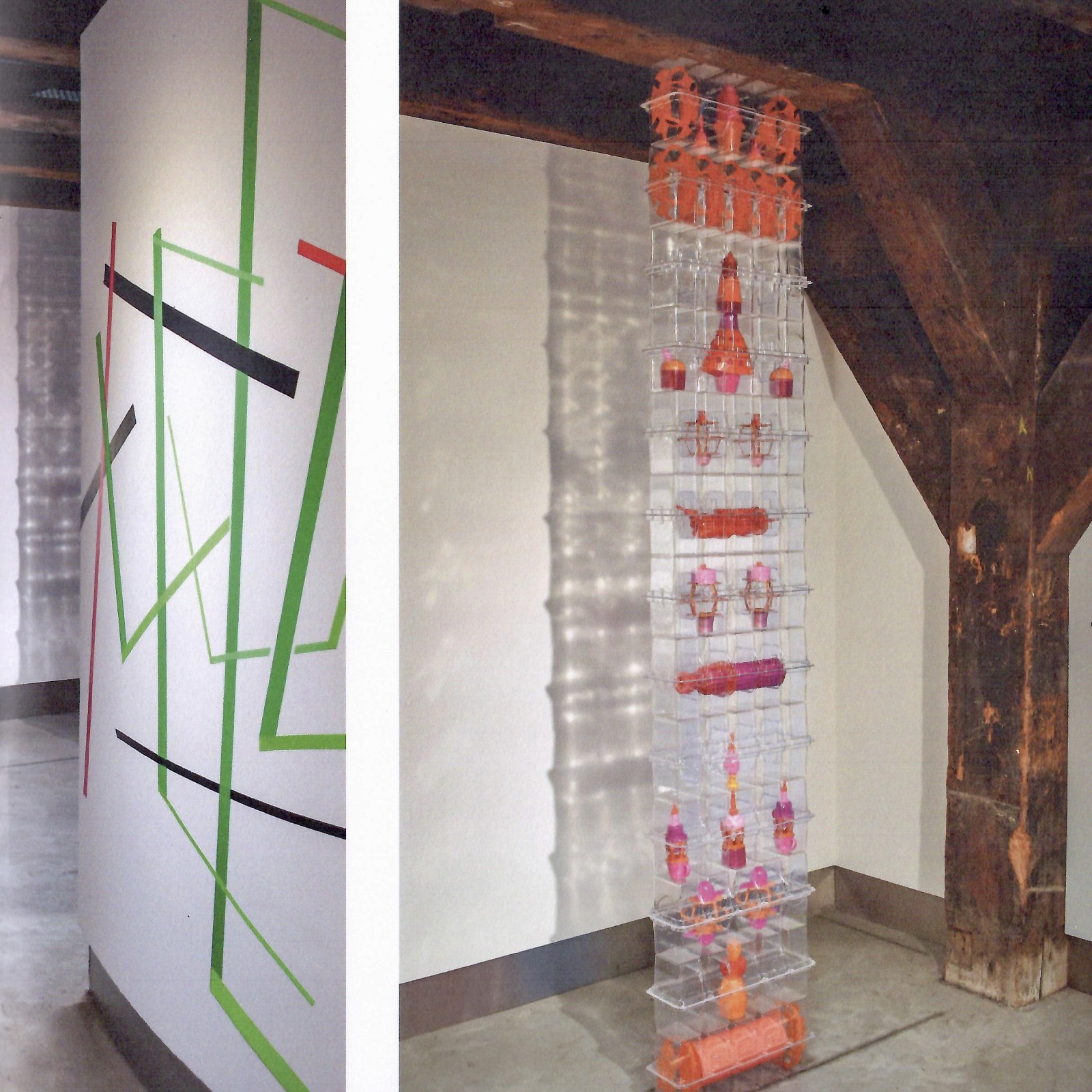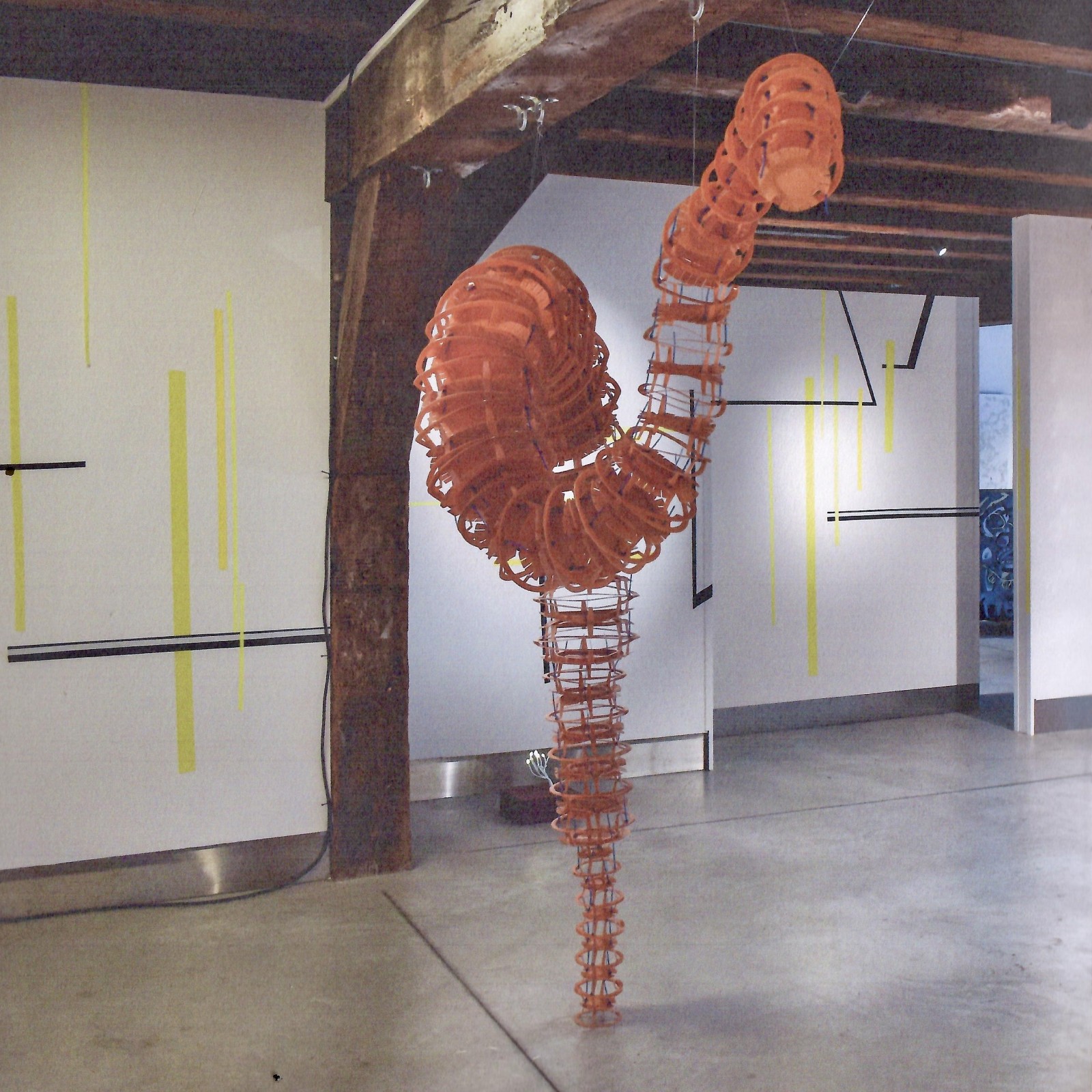 Having familiarised herself with the building's architecture in the Summer Studio, she finally decided to use both types of plastic: transparent and with colour. From transparent spheres, she built a cloud around a support beam from which it rises like a collection of bubbles. Like an orange snake she hung from another beam, it is full of repeating shapes that exude a certain endlessness - befitting the Pandora's box that became the invention of the endless flow of plastic last century.