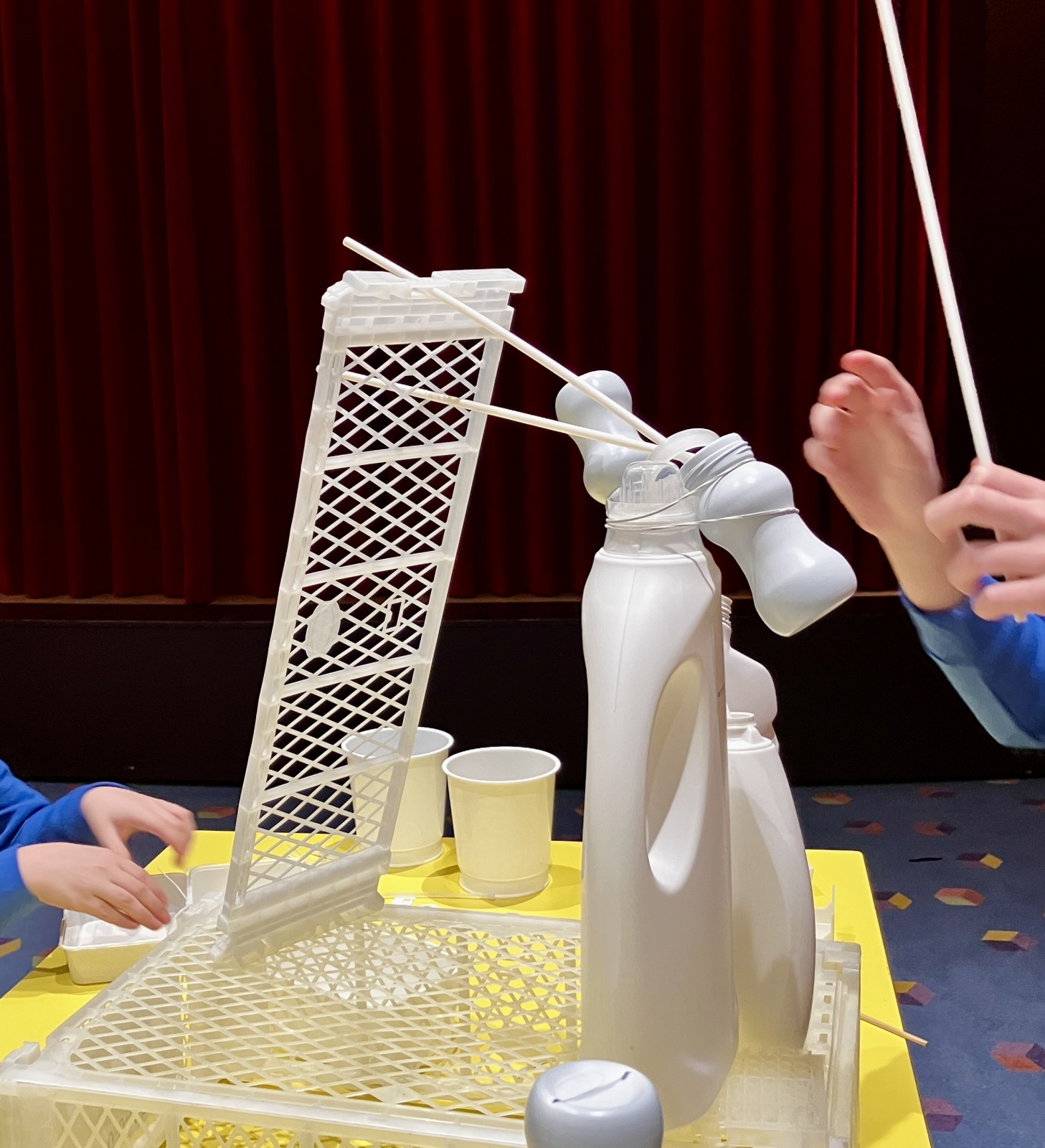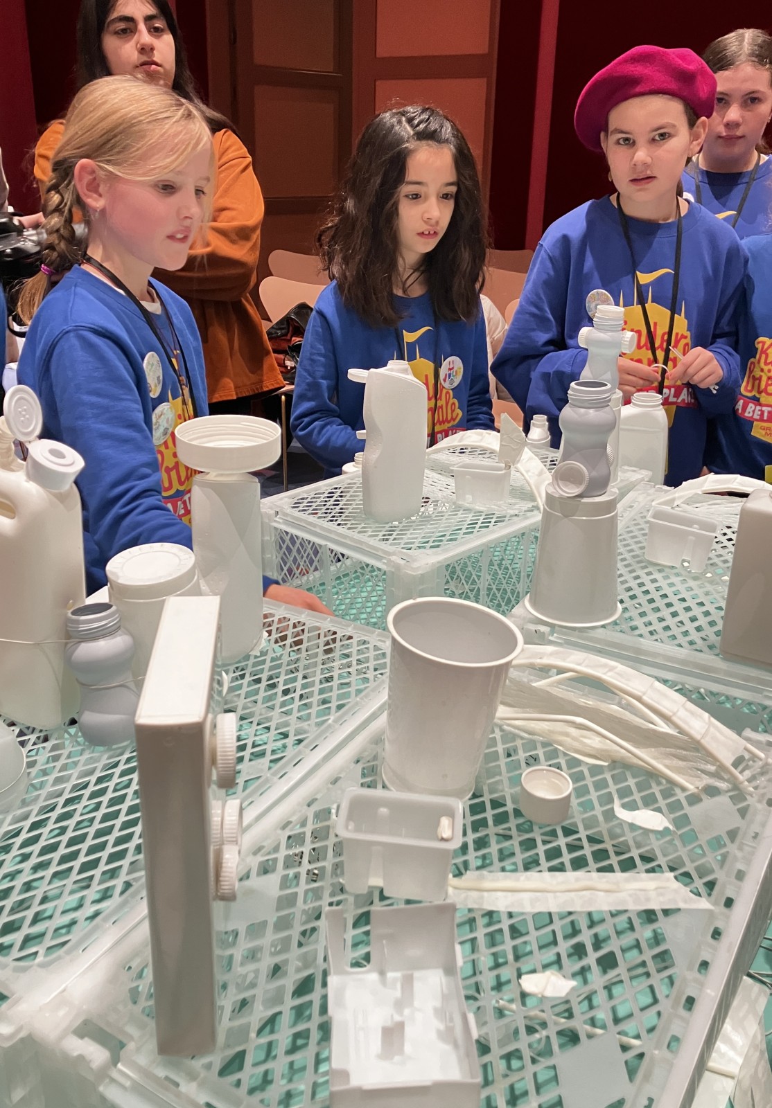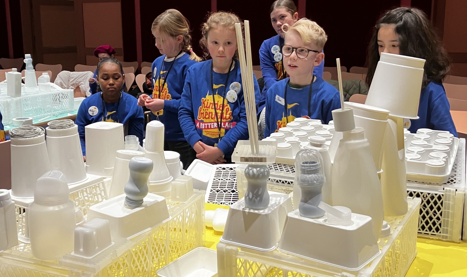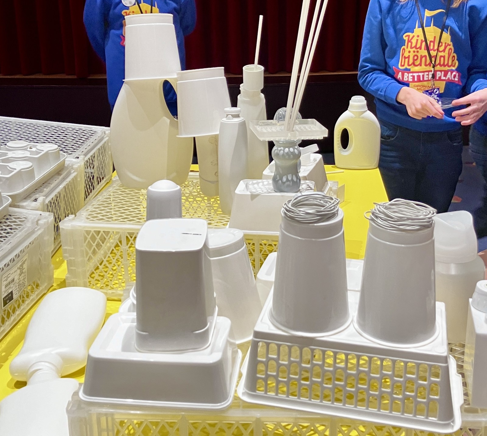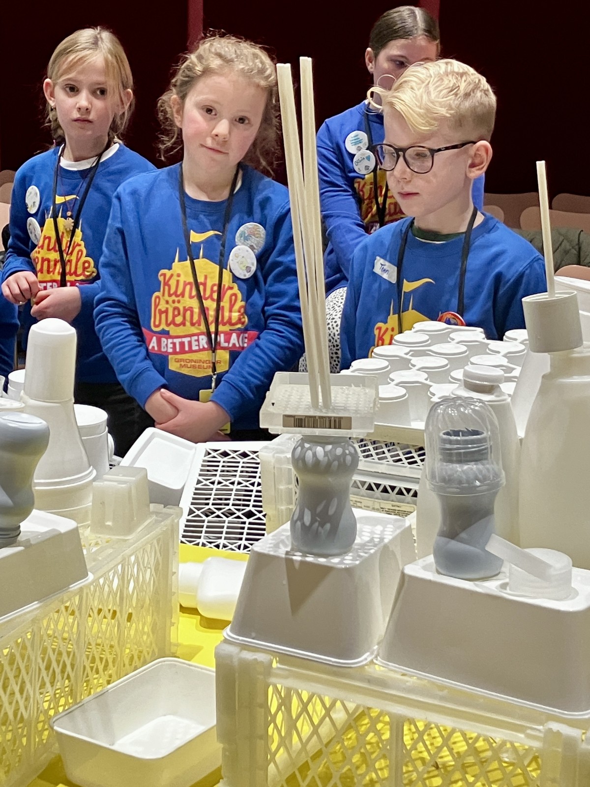 At the Children's Biennial at the Groninger Museum, my work as a visual artist and De Afvaljuf come together perfectly. During the Children's Biennial, you can not only look at art but also do all kinds of things yourself. On one side of my hall is a work of art made of blue plastic waste 'De Blauwe Stad' (The Blue City) and on the other side you can build your own with white plastic waste. Together with the Children's Ambassadors, we tested how best to build. Do all the parts have to be connected and what is the best way to do that? Tested were : tape, tyraps, clay, buddies, rope and much more. Want to know what worked best? Then come to the Children's Biennial at the Groninger Museum yourself. The exhibition can be seen until 3 November.