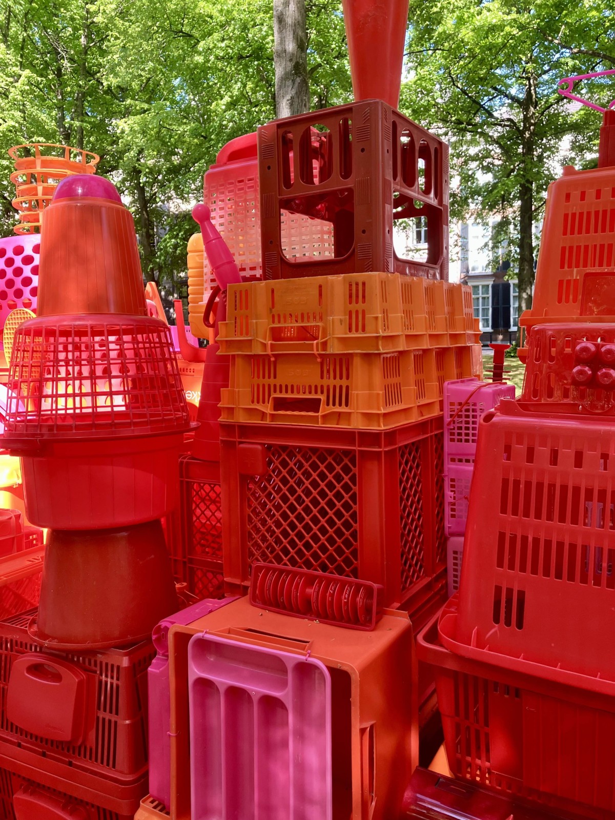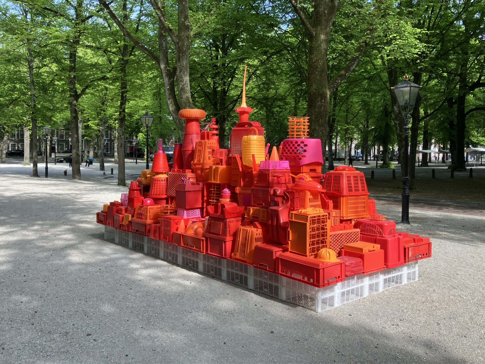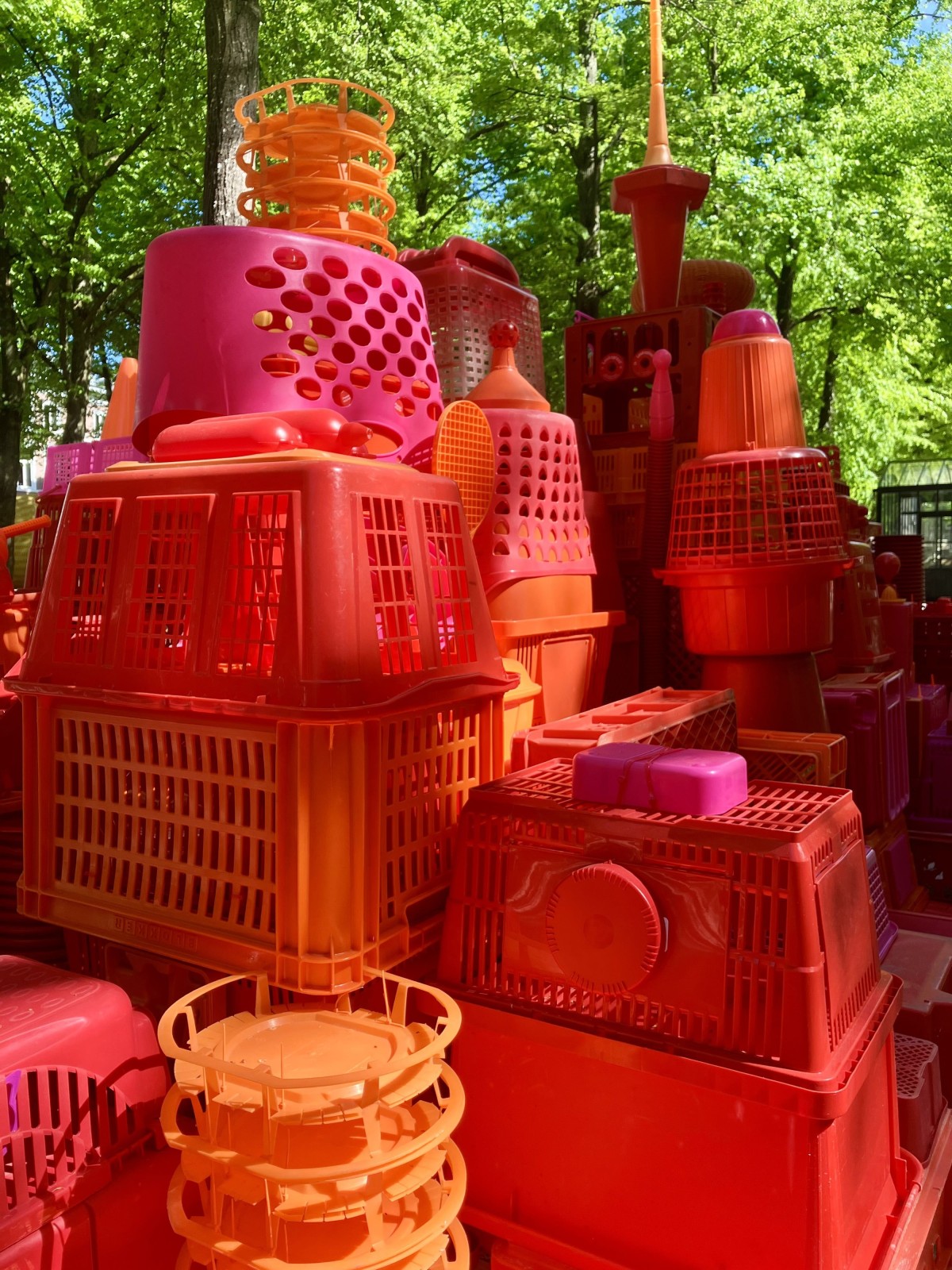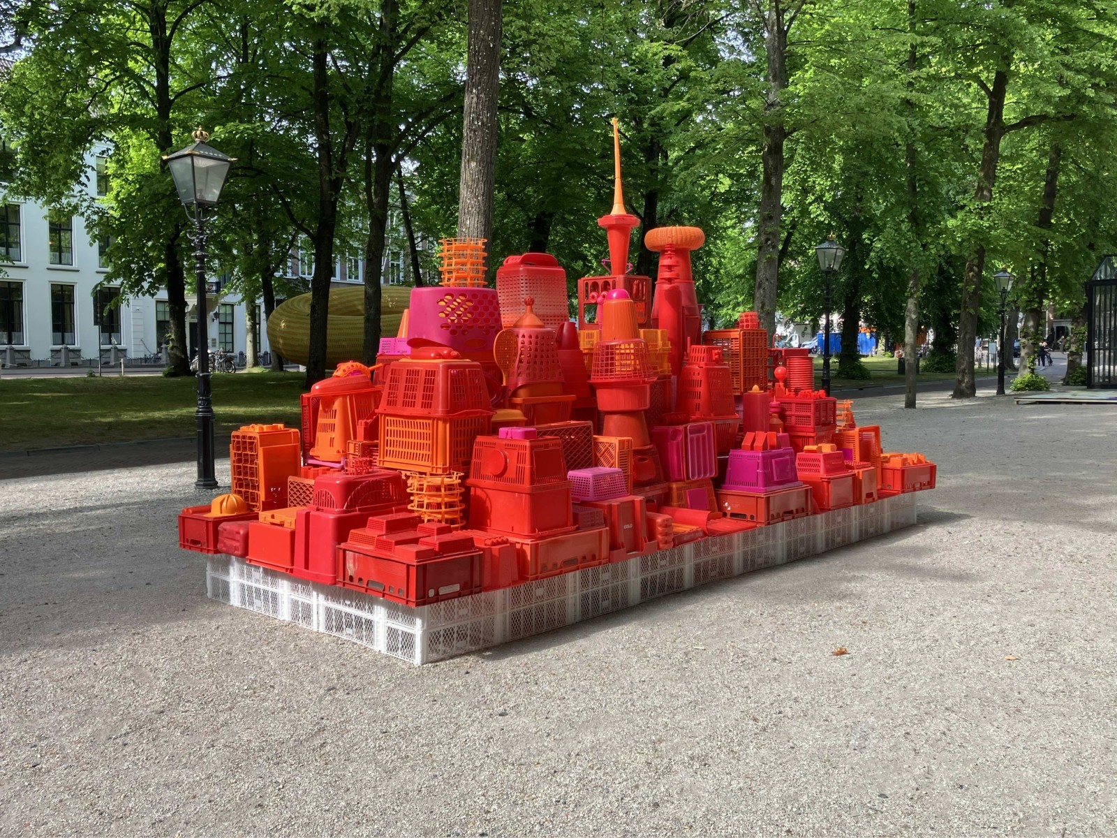 Plastic 734* is a site-specific work I made especially for Voorhout Monumentaal from red, orange and pink plastic waste. All the material used comes from The Hague. As much as 75% of it I collected in the first months of 2025**, the remaining 25% comes from my studio stock.