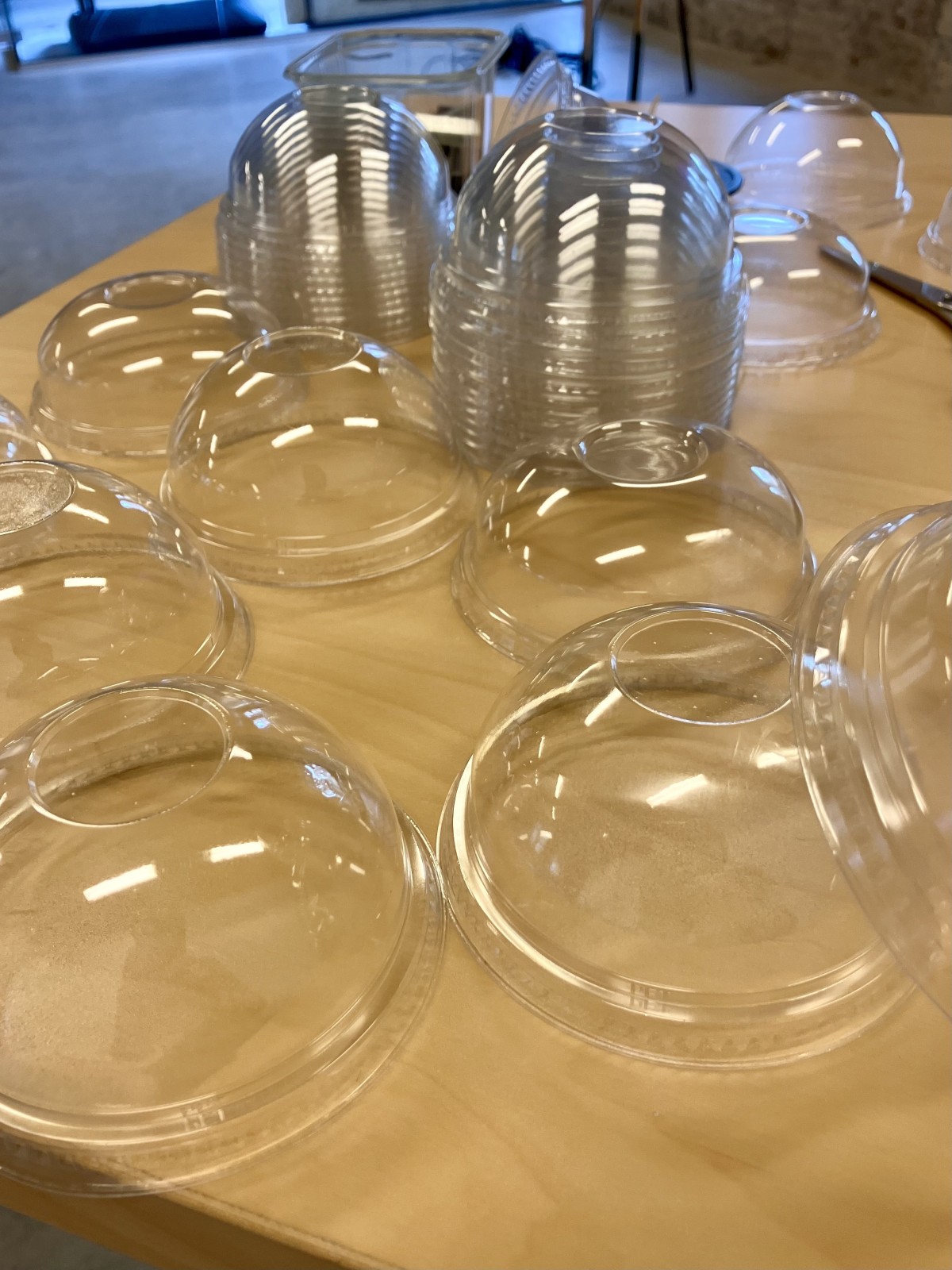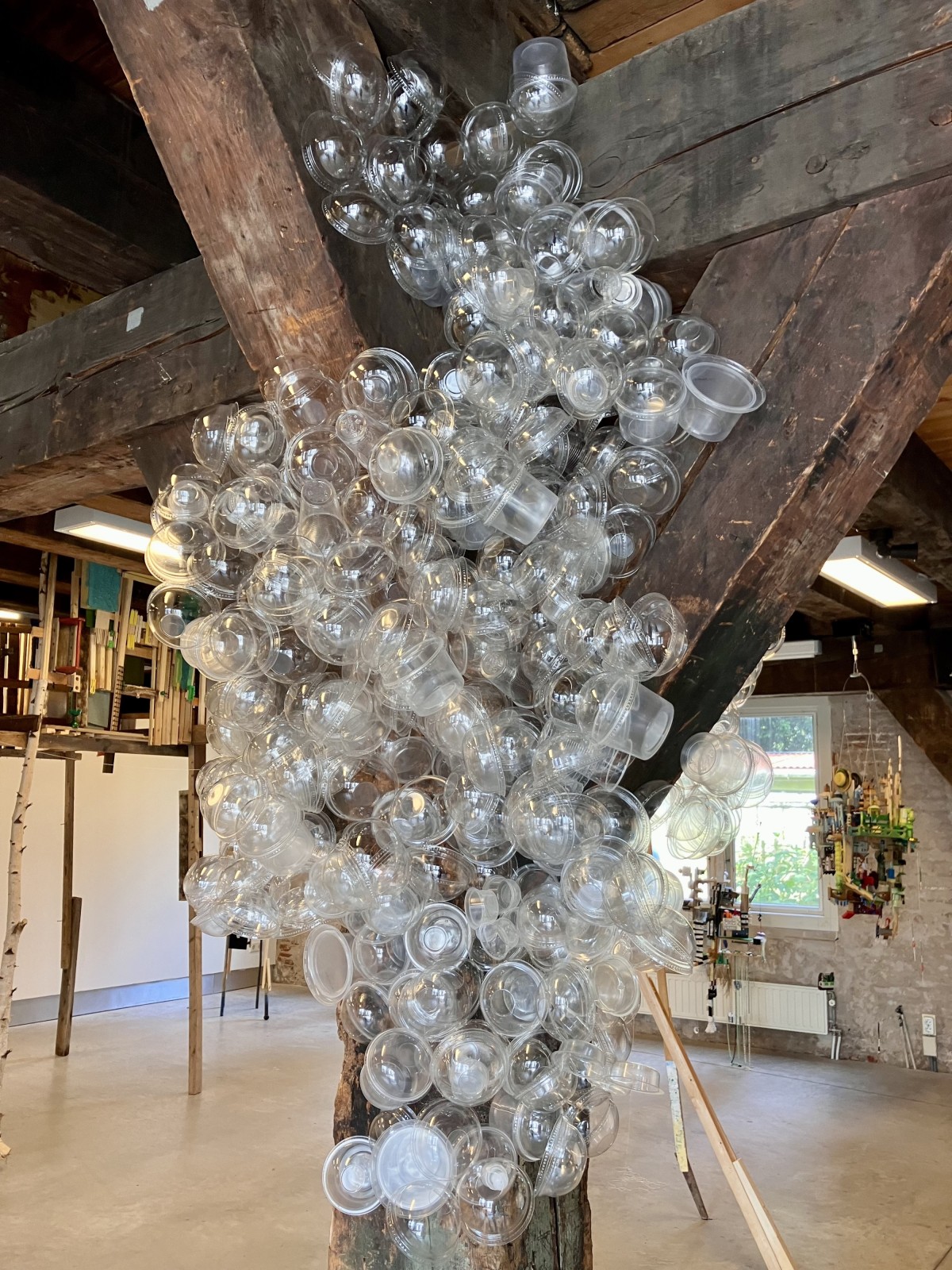Consists of hundreds of lids from cherry tomatoes and other transparent packaging material. These lids were given to me in early 2022 by @mistermokum Too nice to throw away he thought. They were in my studio to be incorporated into the jellyfish collection but found their way into a new work.