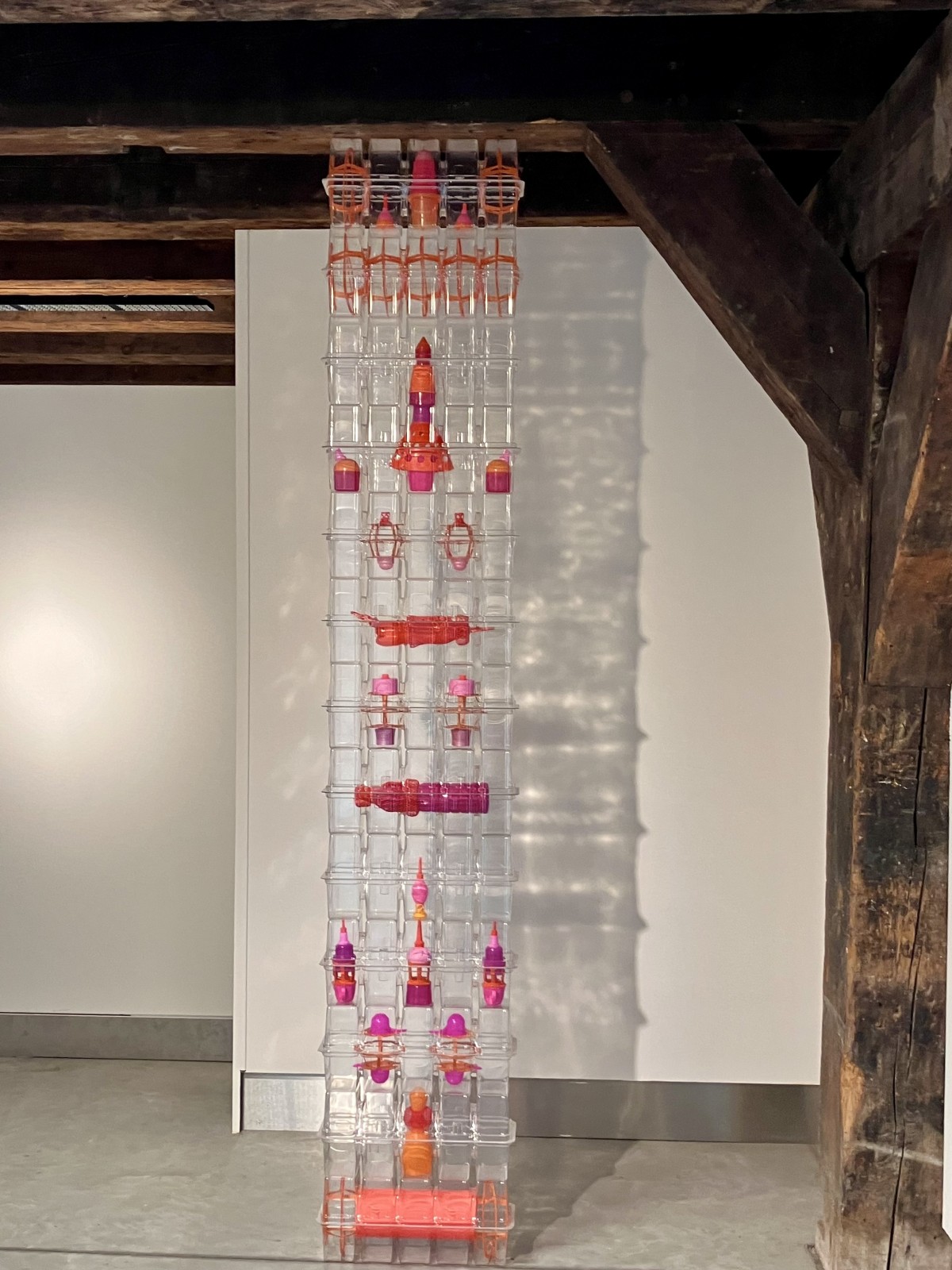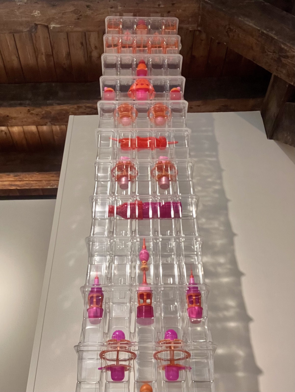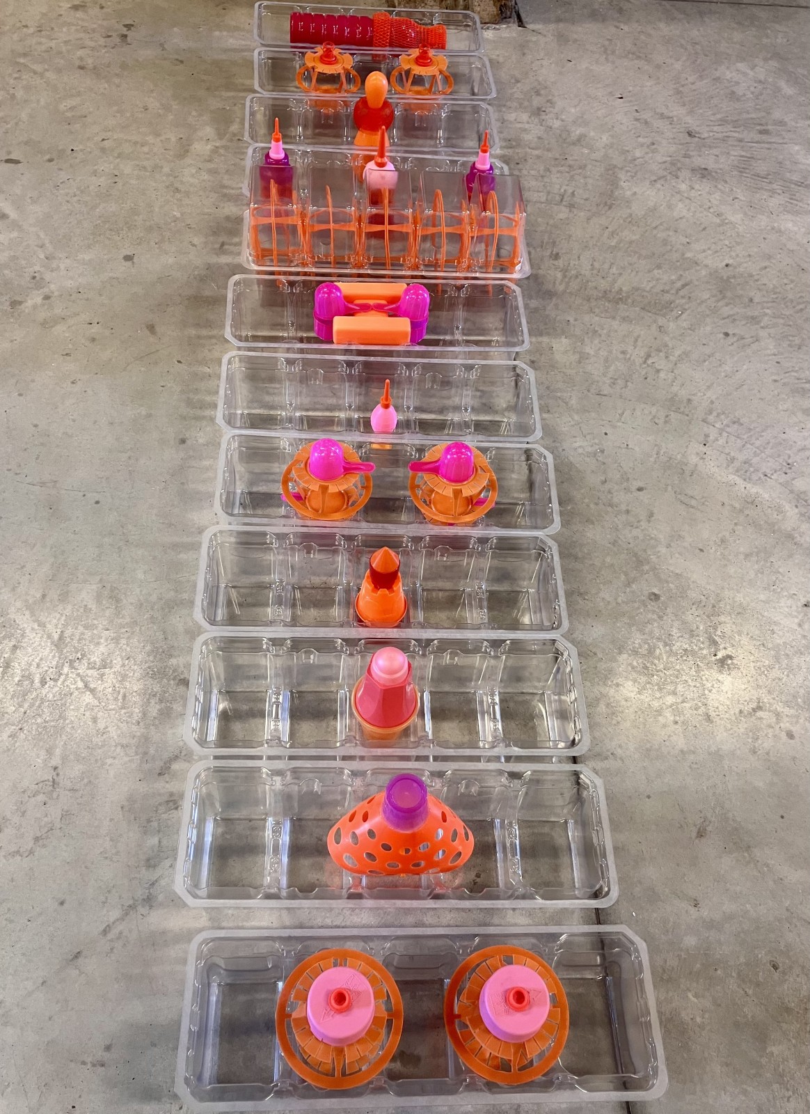 Opgebouwd uit 26 transparante pipetpunt (5x96 stuks) verpakkingen en een roze en oranje plastic afval.